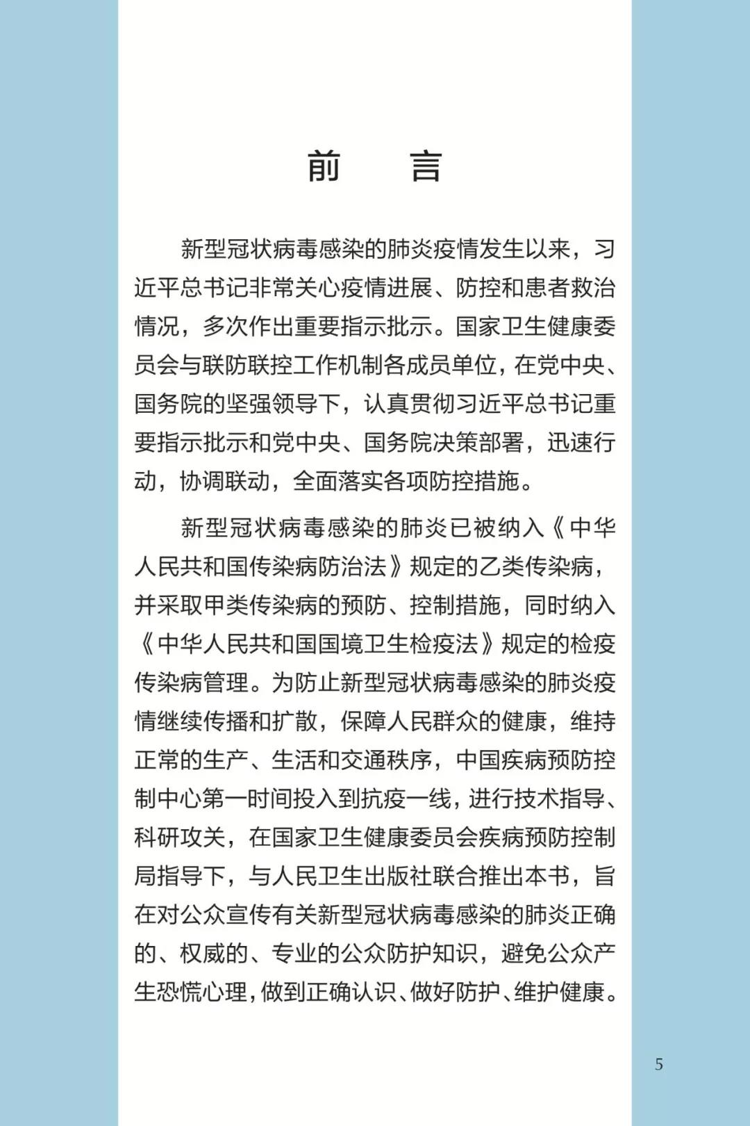 中國疾病預(yù)防控制中心編寫的《新型冠狀病毒感染的肺炎公眾防護(hù)指南》,日前出版發(fā)行。此書聚焦公眾個人與家庭防護(hù)、居家醫(yī)學(xué)觀察、理性就醫(yī)、心理疏導(dǎo)等防治細(xì)節(jié),通過問答形式解讀新型冠狀病毒感染的肺炎有關(guān)問題疑惑,引導(dǎo)公眾正確認(rèn)識,積極做到防治結(jié)合、科學(xué)防護(hù)、消除恐慌、理性應(yīng)對。此書包括圖書、電子書、網(wǎng)絡(luò)版讀物等多種形式,第一批圖書已緊急送往武漢抗擊疫情第一線,電子書、網(wǎng)絡(luò)版讀物在學(xué)習(xí)強(qiáng)國、健康中國、人衛(wèi)健康、掌閱等多個網(wǎng)絡(luò)平臺、微信公眾號公益?zhèn)鞑,并為全國各地提供可印制的PDF版本。